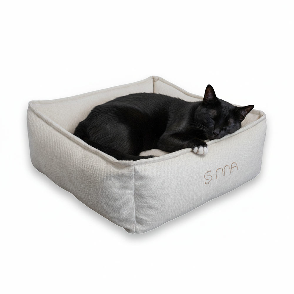 Quadratisches Katzenbett mit superweicher Polsterung – stilvoll, rutschfest & maschinenwaschbar.